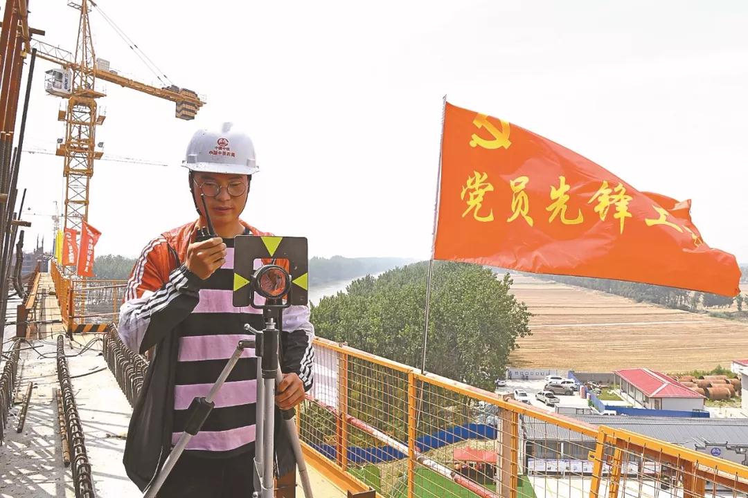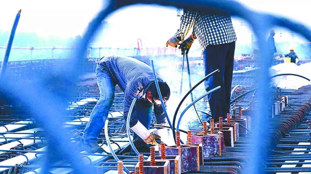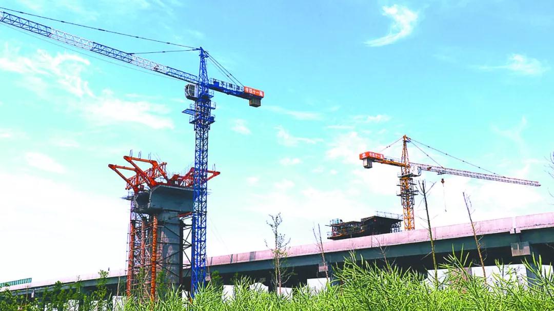6月10日,在盐通高铁通榆河特大桥施工现场,机器声轰鸣,工人们紧张有序地忙碌着。