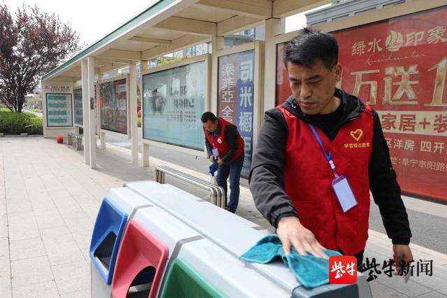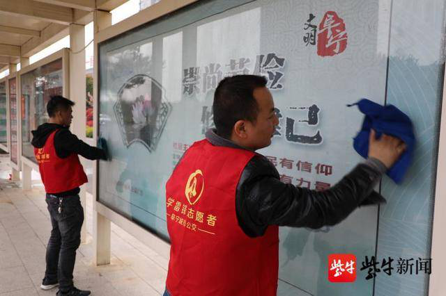 (志愿者擦洗站牌上的灰尘)