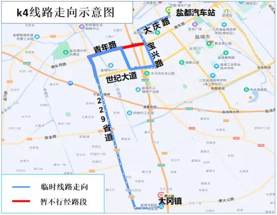 临时线路走向:盐都汽车站北门、大庆路、宝兴路、青年路、世纪大道、振兴路、青年路、229省道、卧龙路S410、呈祥路至大冈;
