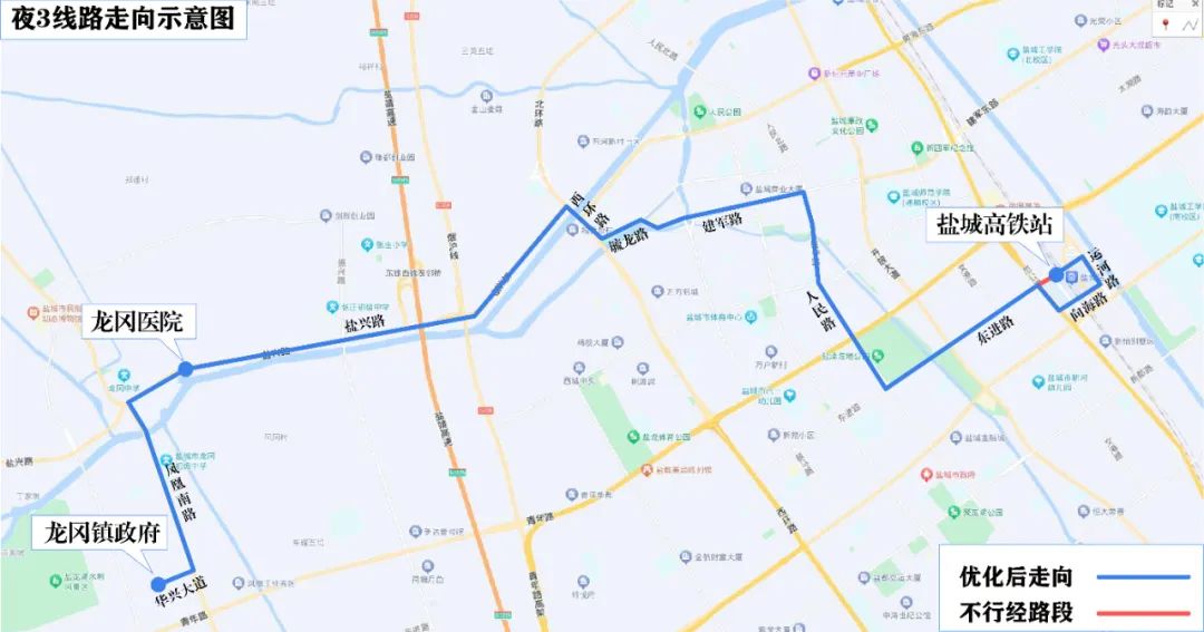 原线路走向:高铁站西广场、东进路、人民路、建军路、毓龙路、西环路、盐兴路、龙冈医院。 优化后走向:高铁站西广场、东进路、运河路、向海路、范公路、东进路、人民路、建军路、毓龙路、西环路、盐兴路、凤凰南路、华兴大道、龙冈镇政府。 新增停靠站点:高铁站东广场、范公路东进路口、青龙华庄、实验小学、凤凰居委会、农科站、龙冈派出所、龙冈法庭、龙冈工业园、龙冈镇政府。 不再停靠站点:高铁站西广场北。