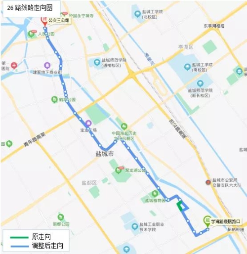 26路:学海路康居路口开往人民路迎宾路口方向,保持原走向不变。