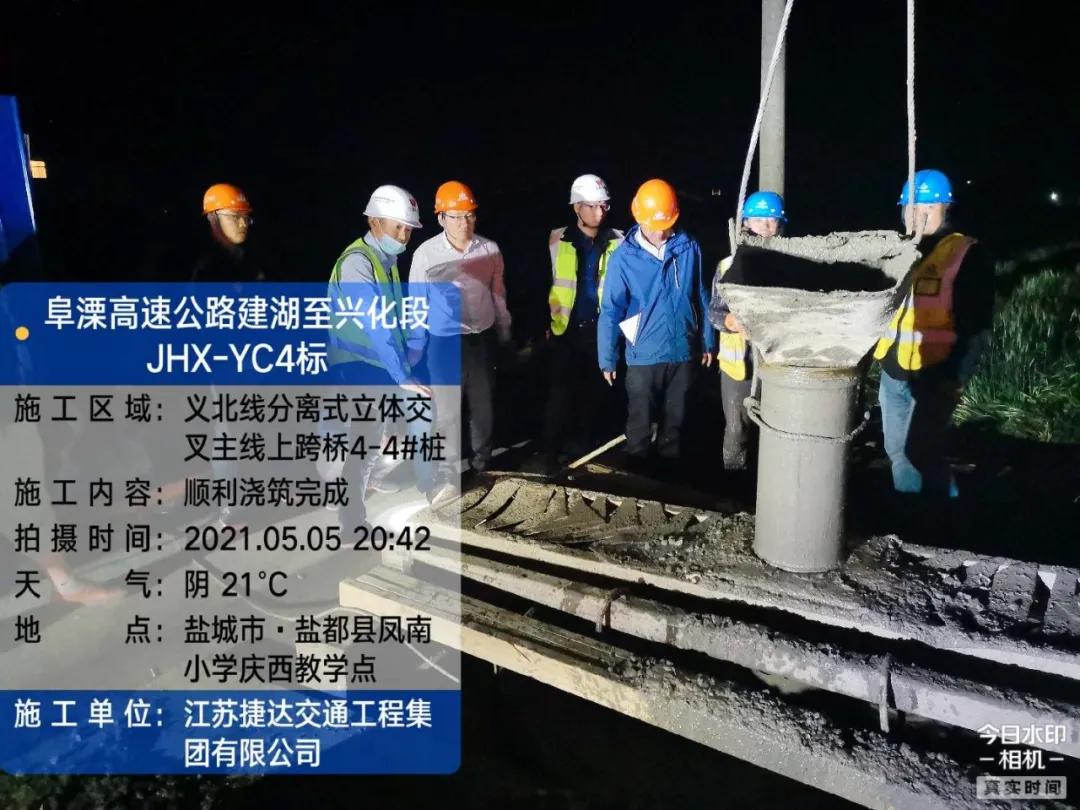●5月5日21时,建兴高速公路盐城段4标灌注桩首件施工顺利完成,给“五一”画上了圆满的句号。