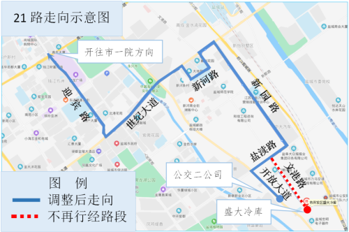 调整后走向:建军西路、毓龙路、小海路、沿河路、解放桥、南城河路、迎宾路、世纪大道、兴业路、新河路、文港路、世纪大道、新园路、盐渎路、开放大道、公交二公司。