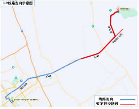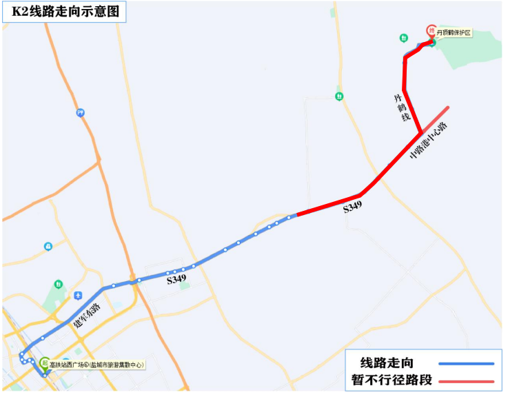 K2线原走向:丹鹤路、中路港、349省道、盐东镇集镇路、349省道、建军东路、文港路、大庆路、范公路、五星路、运河路、东进路、高铁站西广场。