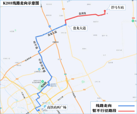 暂停运营K202线和301线,恢复正常运营时间将另行通知。 截短运营K203线和K2线 K203线原走向:洋马镇、盘黄线、盘龙大道、盘青线、青墩连接线、机场路、建军路、天山路、青年路、范公路、东进路、高铁站西广场。