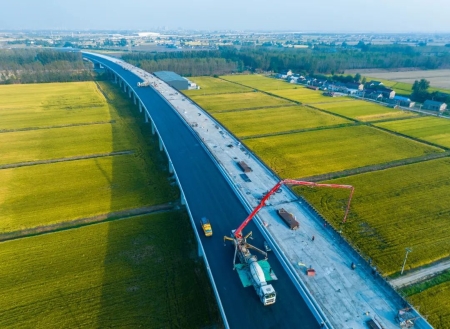 目前,桥梁结构物、灰土、水泥稳定土基层全部完成,桥面铺装、沥青摊铺、护栏护坡施工均进入扫尾,交安设施、伸缩缝安装正在快速推进,施工现场一片繁忙景象。