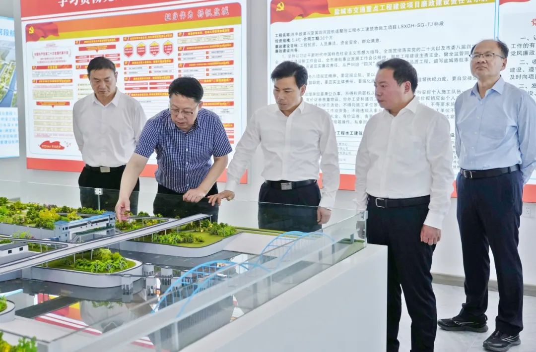 在连申线灌河至黄响河段航道整治工程现场,调研组认真听取了工程进展情况汇报,实地察看建设情况,详细了解项目推进过程中遇到的困难并现场会办。