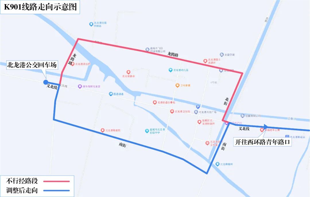 原线路走向:西环路青年路口、西环路、东进路、盐马路、青年路、S331、S231、杨斌路、富康路、奎园路、幸福路、开创路、富康路、盐金路、S231、兴丰路、鹏程路、义北线、北街、龙腾路、义北线、北龙港公交回车场。 调整后走向:西环路青年路口、西环路、东进路、盐马路、青年路、S331、S231、杨斌路、富康路、奎园路、幸福路、开创路、富康路、盐金路、S231、兴丰路、鹏程路、义北线、南街、龙腾路、义北线、北龙港公交回车场。