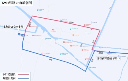 原线路走向:北龙港公交回车场、义北线、龙腾路、北街、义北线、楼大线、S331、楼北线、北街、龙腾路、义北线、北龙港公交回车场。 调整后走向:北龙港公交回车场、义北线、龙腾路、南街、义北线、楼大线、S331、楼北线、北街、龙腾路、义北线、北龙港公交回车场。 暂不停靠站点:龙兴。