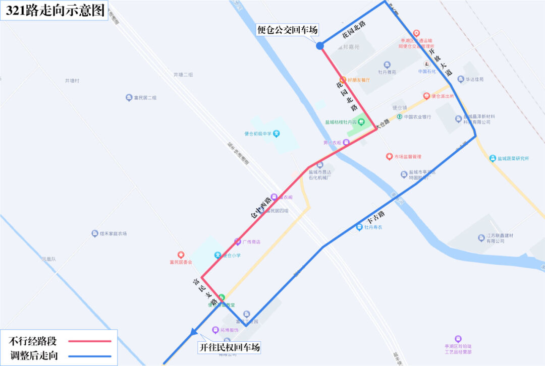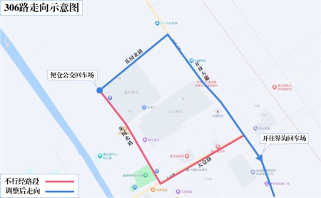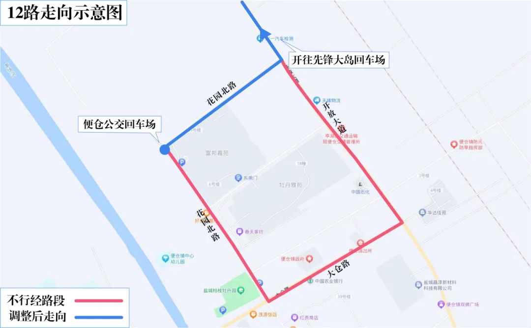 调整后走向:便仓公交回车场、花园北路、开放大道、卞古路、富民支路、大仓路、民权回车场。