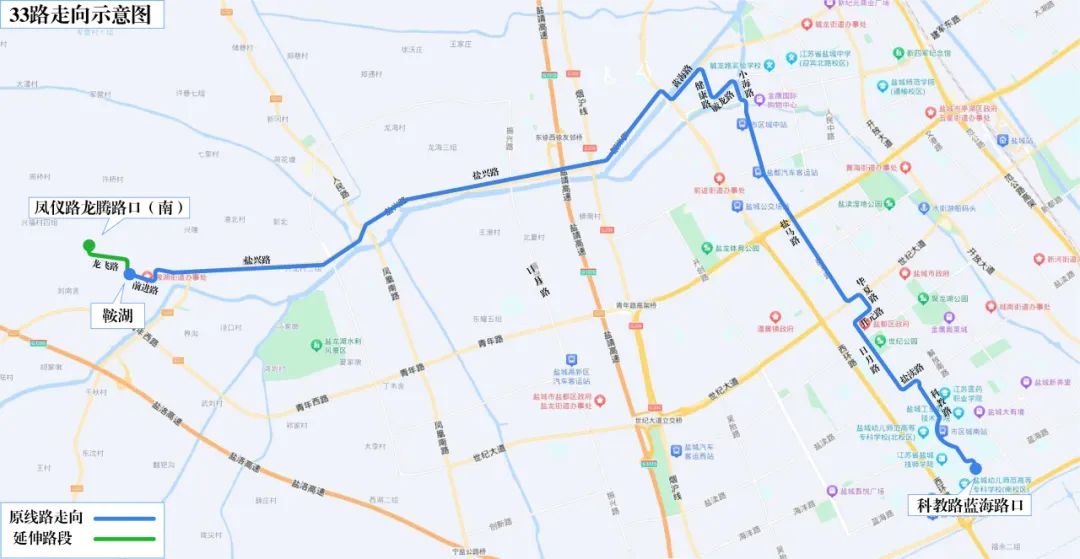 延伸后走向:科教路蓝海路口、科教路、盐渎路、日月路、开元路、华夏路、世纪大道、盐马路、小海路、毓龙路、健康路、黄海路、北环路、盐兴路、振兴路、祥和路、前进路、龙徐路、龙飞路、凤仪路、凤仪路龙腾路口(南)。