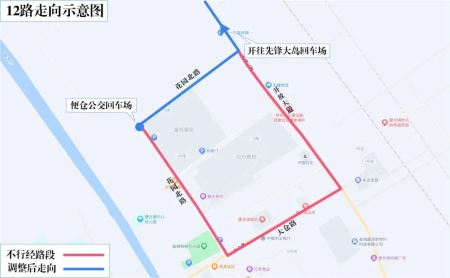 调整后走向:先锋大岛回车场、黄海路、西环路、毓龙路、小海路、建军路、开放大道、花园北路、便仓公交回车场。