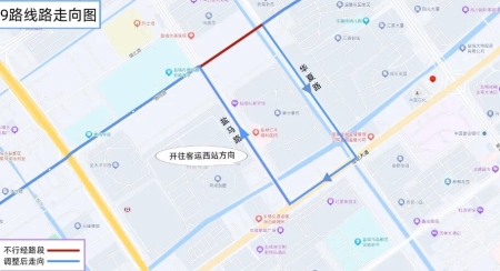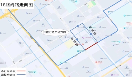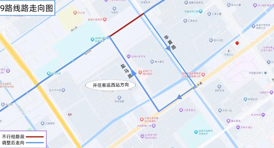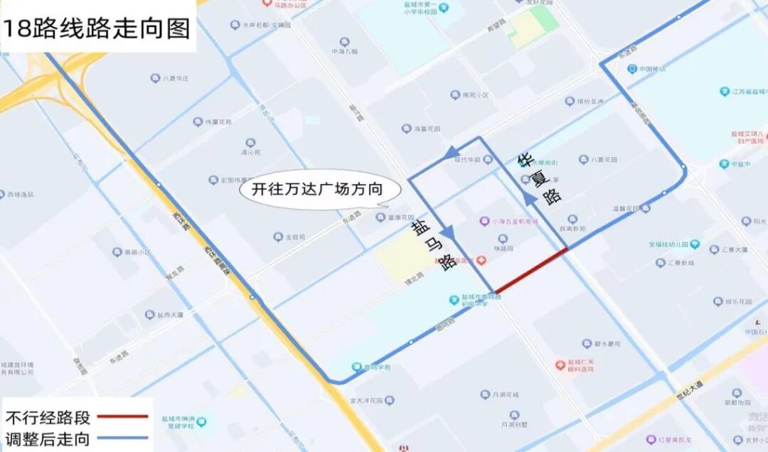 调整后走向:万达广场、西环路、鹿鸣路、盐马路、东进路、华夏路、鹿鸣路、解放路、东进路、运河路、新都路、天山路、世纪大道、盐城市妇幼保健院。