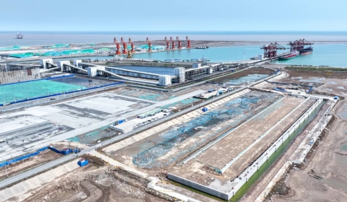 滨海港区自然条件优越,具备深水贴岸、锚地广阔、海床平坦、潮差较小等特点,是建设航道码头条件较好的深水港址。“得益于良好的自然条件,我们在保证质量和安全的前提下,抢时间、赶进度,确保道路混凝土面层施工和港池陆上开挖。”王震说,码头主体结构部分除级配水稳、面层、轨道和门机安装,其他全部完成,道路堆场部分地基处理也已全部完成。
