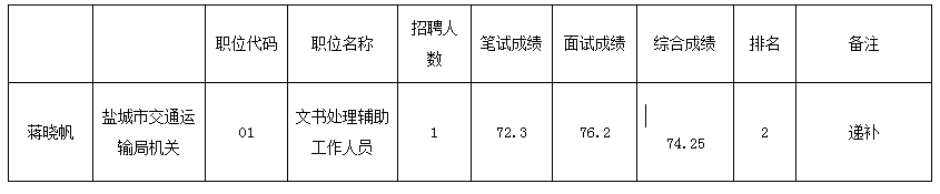 因报考盐城市交通运输局机关政府购买服务用工的考生耿其杨主动放弃体检,根据公告要求,现从该岗位面试人选中,按照综合成绩从高到低进行递补,名单公布如下: